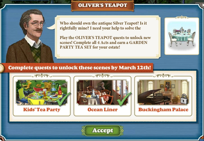 "Who should own the antique Silver Teapot? Is it rightfully mine? I need a Guardian's help! Play the OLIVER'S TEAPOT quests to unlock new scenes! Complete all 4 Acts and earn a GARDEN PARTY TEA SET for your estate!"